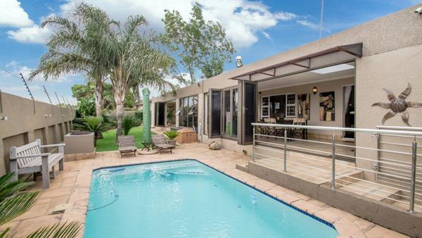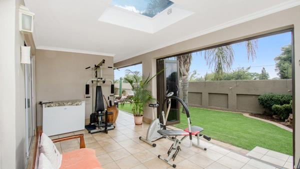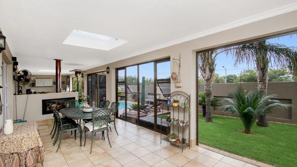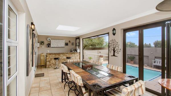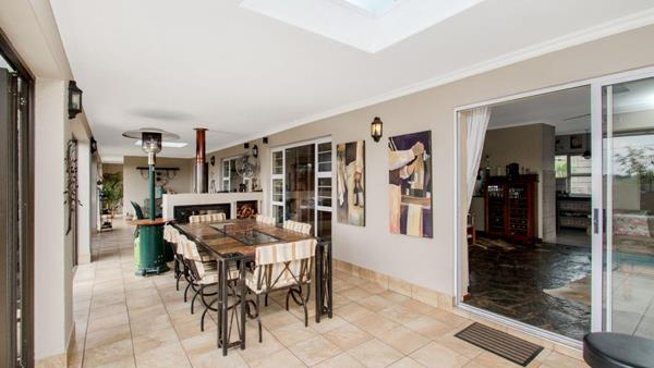 Spacious entertainment area with bar, skylight, dual wood burning fireplace and stacking doors overlooking the pool.