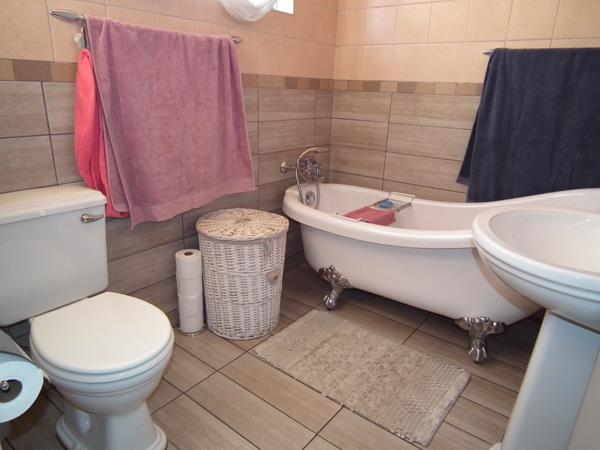 The home provides three well-appointed bedrooms, including a main bedroom with extensive built-in wardrobes. The two bathrooms include an en-suite, which features a charming classic clawfoot bathtub, pedestal sink, and tiled finishes, adding a touch of traditional elegance and functionality.