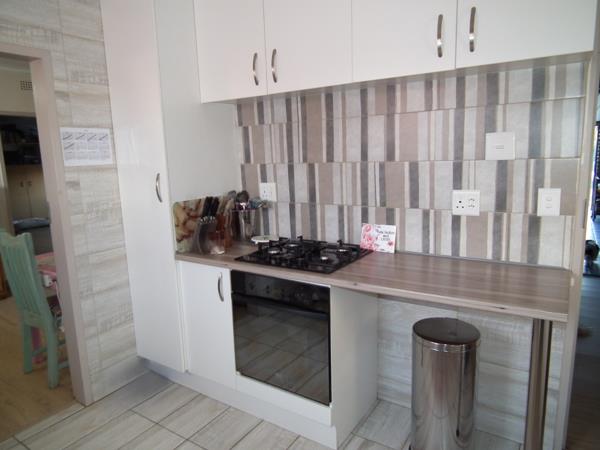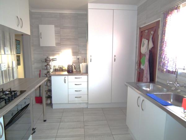 Nestled in the suburban locale of Mindalore, Krugersdorp, this inviting 3-bedroom, 2-bathroom family home offers comfortable living and excellent entertainment opportunities. An entrance hall welcomes you into a spacious lounge, featuring light wood-look flooring and a prominent brick fireplace, creating a warm ambiance. The modern kitchen is a highlight, boasting clean white cabinetry, a stylish striped backsplash, built-in oven, and gas hob. Ample counter space and a practical extension flow seamlessly into the dining area, perfect for family meals and social gatherings.