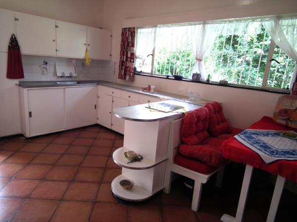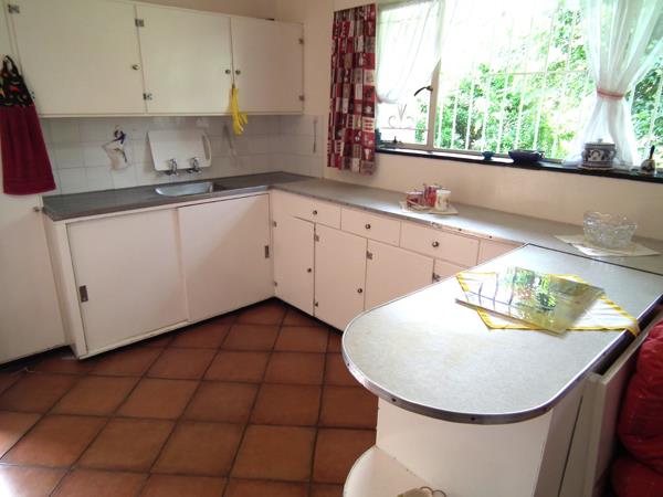 The U-shaped kitchen retains its original retro charm, offering excellent cupboard space and a built-in breakfast barpresenting a perfect opportunity for a stylish modern renovation.
