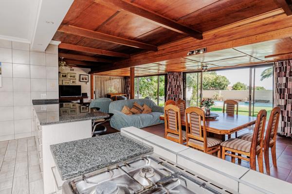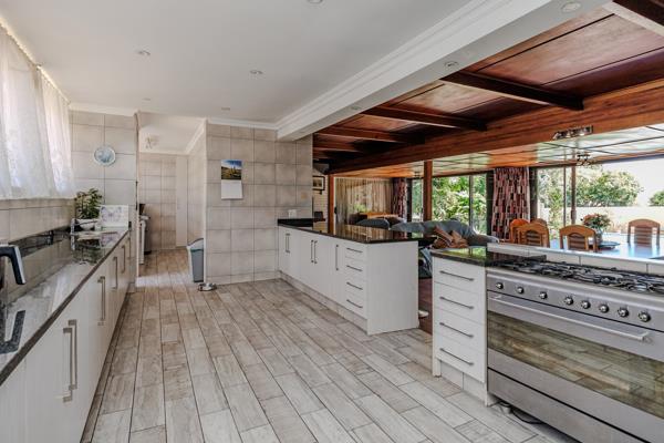 The expansive open-plan living area is bathed in natural light and opens up to lovely views, creating a warm and welcoming environment for family life and entertaining. The spacious kitchen is both functional and stylish, featuring granite countertops, ample built-in cupboards, and a separate scullery that keeps the main space clutter-free.