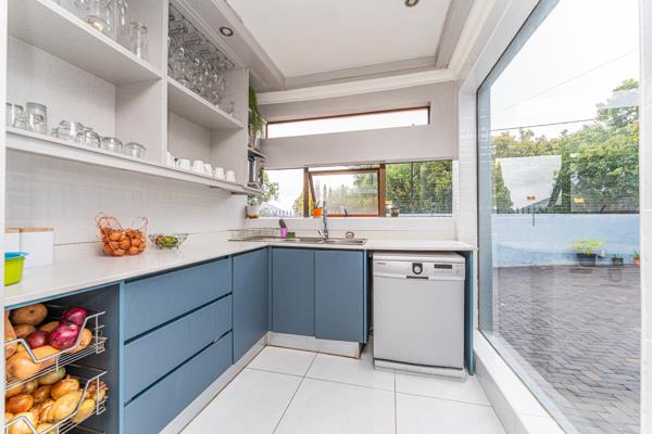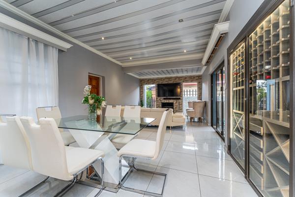 The stunning ultra-modern kitchen flows seamlessly into the open-plan dining room and lounge, creating a welcoming space for everyday living and entertaining. The dining area features a built-in wine rack and display cabinet, adding both practicality and character. A separate TV room provides additional living space for the family.