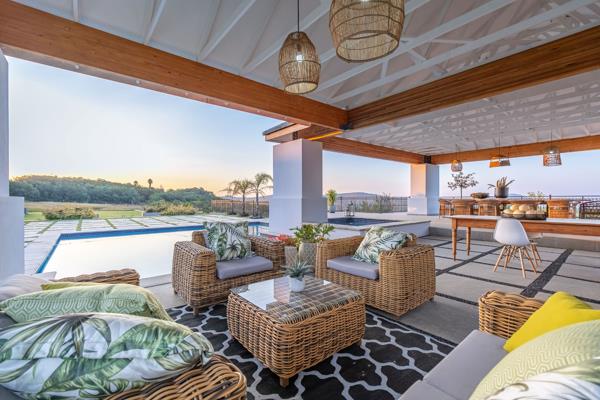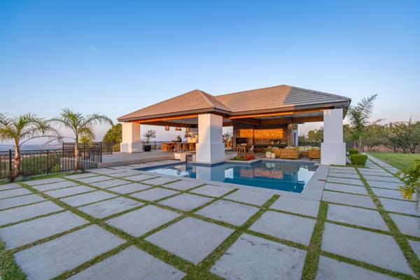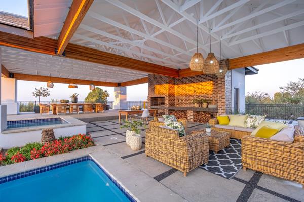 The exceptional outdoor pavilion is a true entertainers paradise. Perfectly positioned to take in sweeping views of that magnificent landscape, this beautifully appointed space offers a seamless fusion of relaxation and refined hosting. The area features a built-in braai, cozy lounge seating, and a spacious dining zone, all set beneath a stylish roof with exposed timber beams for added warmth and character. At its heart, lies an inviting swimming pool, framed by stone pavers and lush greenery -ideal for sun-drenched afternoons or evening dips. Amidst the manicured garden is a amazing sunken firepit lounge where you can indulge your senses and take in the beautiful starry skies on a clear night.