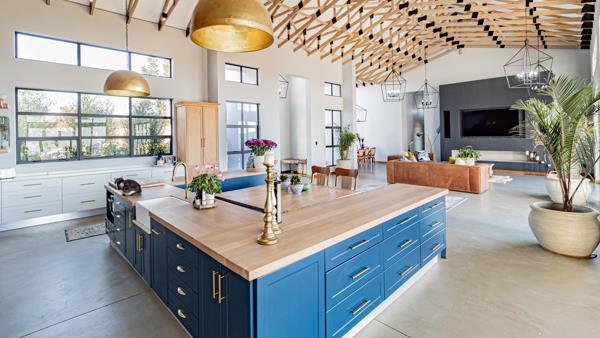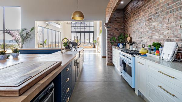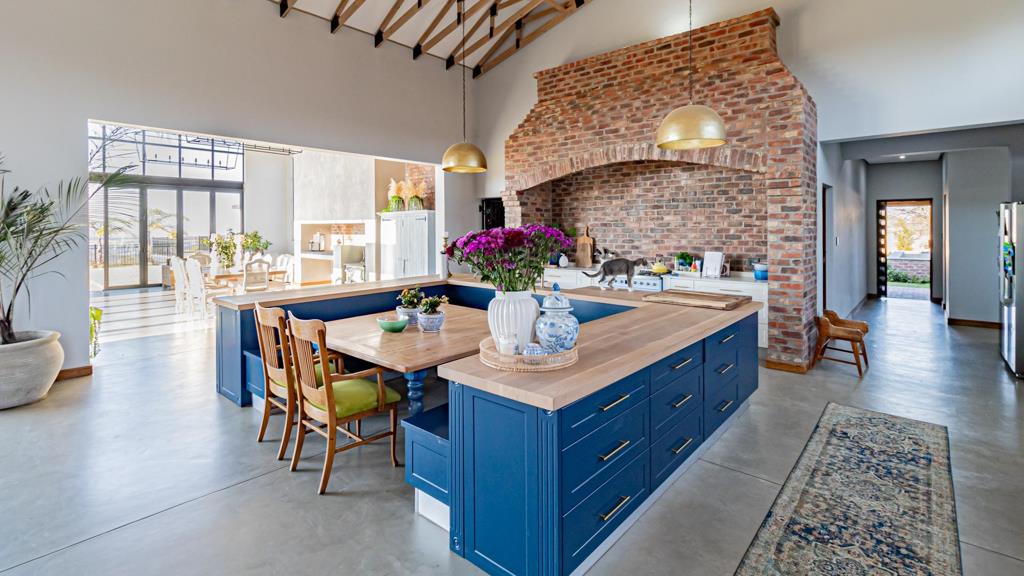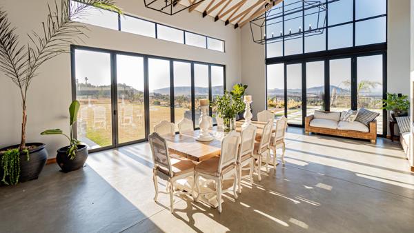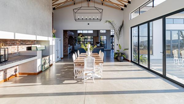 Step inside to discover soaring double-volume ceilings, exposed timber beams, and panoramic glass stacking doors that flood the home with natural light and seamlessly blend indoor luxury with outdoor serenity. The open-plan design features Cemcrete flooring, two biofuel fireplaces, and a designer farm-style kitchen with oak veneer countertops and a high-end Smeg gas stove, ideal for culinary creativity and entertaining.
