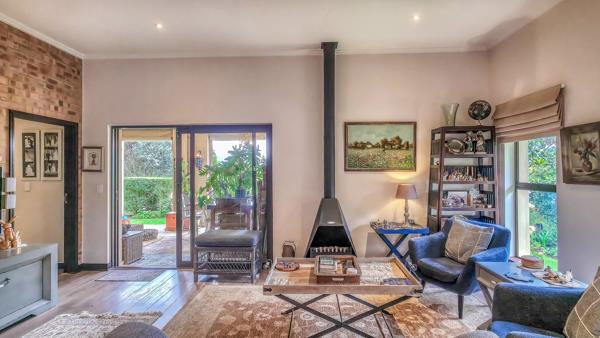 Step inside to a beautifully appointed open-plan lounge, dining area, and country-style kitchen, complete with a gas hob and warm, rustic finishes. The inviting fireplace in the lounge creates a sophisticated focal point for cozy evenings, while expansive sliding doors open effortlessly onto a covered entertainers patio featuring a built-in braai the perfect setting for elegant alfresco dining.