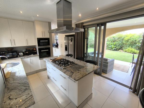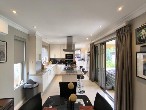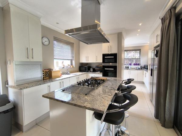 The modern open-plan kitchen is an entertainers delight with a center-island gas hob, scullery, laundry area, breakfast nook and ample countertop space. The living areas flow effortlessly onto a patio with scenic views across the estate.