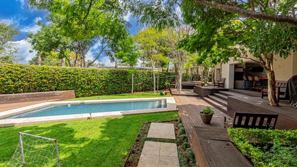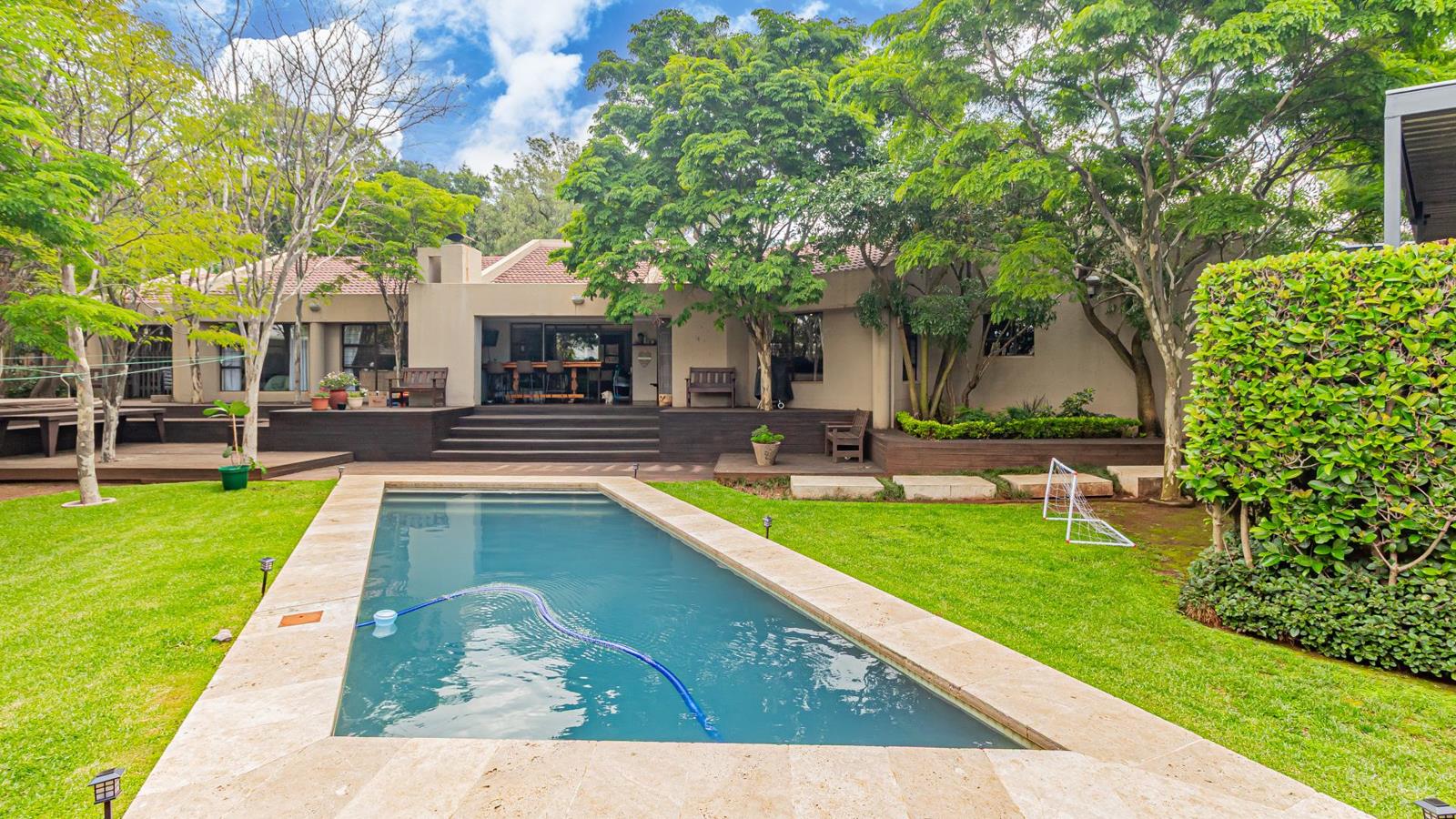 private oasis featuring a sparkling swimming pool, a relaxing jacuzzi, and an expansive deck and patio area, complete with a built-in braai for alfresco dining and entertaining. The established garden benefits from a sprinkler system and water tanks, promoting easy maintenance. Parking is abundant with two garages and three additional parking spaces. The property also includes domestic rooms, adding to its comprehensive functionality. Security is a priority, with features such as an alarm system, electric fencing, burglar bars, and security gates providing peace of mind. Modern conveniences include a gas geyser for energy efficiency and fibre internet connectivity, ensuring you stay connected. Pets are welcome, making this a truly family-friendly environment.