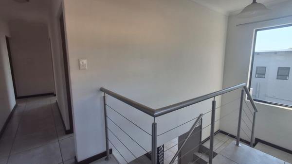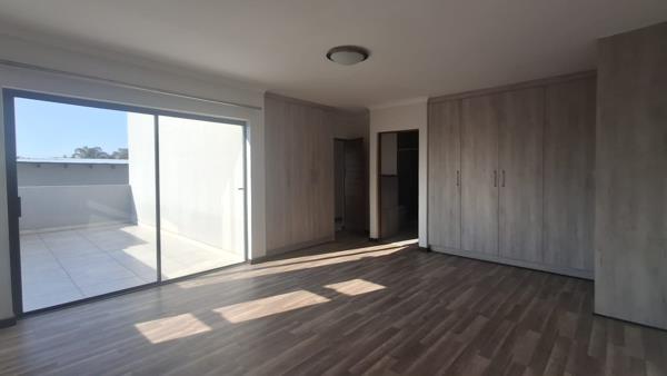 It offers 3 bedrooms with laminate flooring. The main bedroom is double-sized, has loads of built-in cupboards, a private balcony with stunning views, and an en-suite bathroom with a shower.