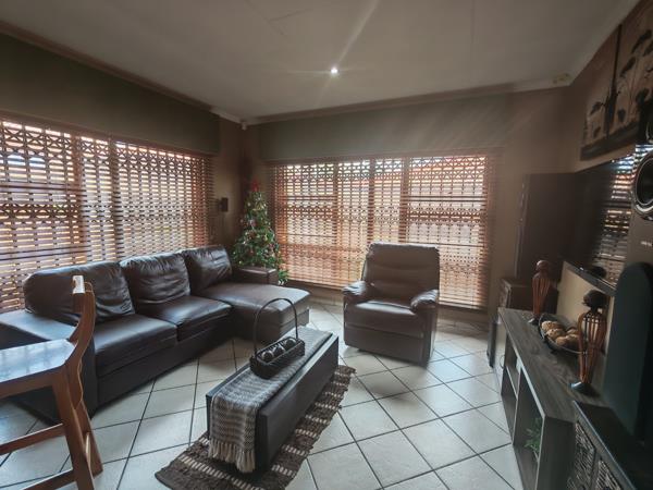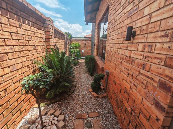The main bedroom is air-conditioned, complemented by laminated floors throughout and a full bathroom with bath and shower. Entertain on the covered patio with built-in braai, overlooking a private, easy-care garden with irrigation.