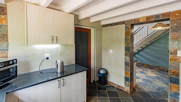At the front, the home offers a lovely garden, double carport, and double garage with direct access into the house. For peace of mind, the property includes an alarm system, electric fencing, and double-glazed aluminum windows for comfort and security.