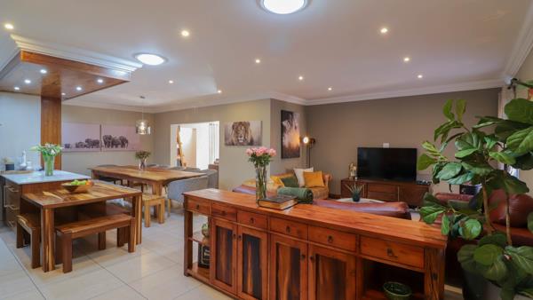 The open-plan kitchen is a focal point and has designer solid kiaat wood units finished with a solid kiaat table/nook and bulkhead with downlights, 3 matching benches to complete a designer kiaat display cabinet to remain on the premises.