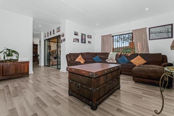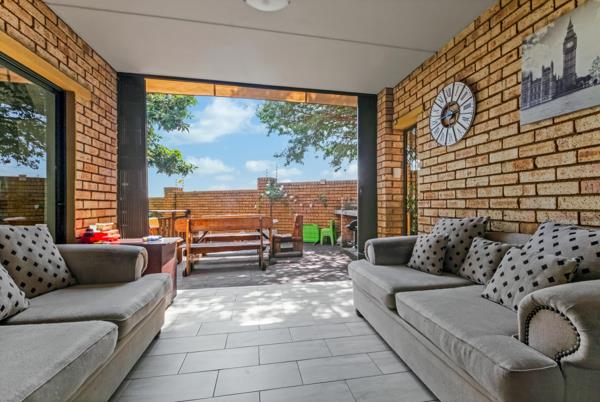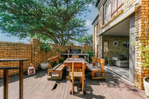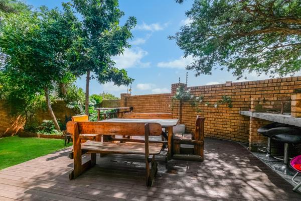 The living area extends onto a patio and deck, complete with a built-in braai, overlooking a private, well-kept garden that''s perfect for entertaining or relaxing.