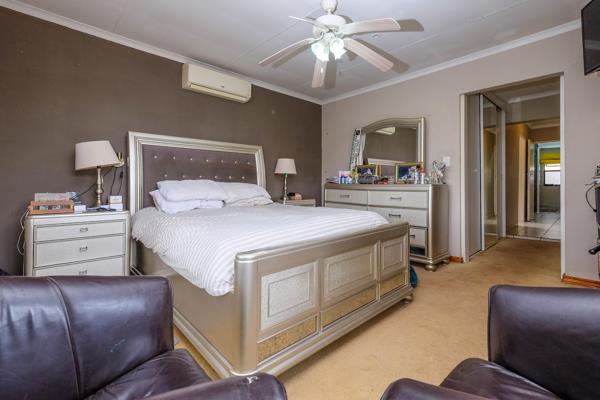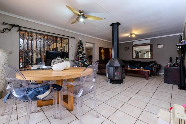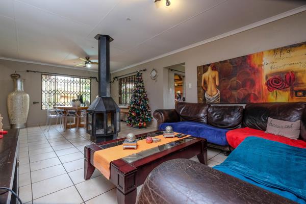 The kitchen is well suited for everyday living and entertaining, fitted with a gas stove and scullery, and flows seamlessly into the open-plan lounge and dining area. An additional lounge opens onto the lapa, featuring a built-in braai, swimming pool, and back garden, creating an inviting space for outdoor living and hosting.