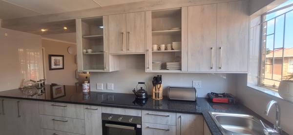 This spacious Townhouse with three bedroom in a secure complex is waiting on the new family. When you enter the unit you will feel at home with all the open plan areas, the dining room is airy flowing into the lounge area, that leads out on to the covered patio and private garden. Here you will enjoy the sun sets with that special person on your side. All three- bedrooms have built in cupboards and are a well sized. The Main bedroom has an En-suite. The second bathroom has a shower. The heart of the home is the kitchen, is has been recently remodeled and put adds modern kitchen feeling to it. Ample cupboard space, granite countertops. The back door leads to the back court yard for the washing line. You have a single garage next to the unit and an additional parking bay for friends.