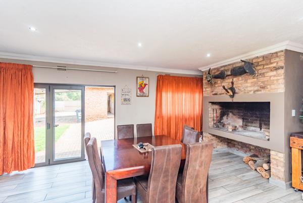 The heart of the home is the spacious, well-appointed kitchen, offering ample cupboard space and a gas stoveperfect for both everyday cooking and hosting guests. The kitchen flows effortlessly into the open-plan lounge, TV room, and dining area, creating a seamless living environment. A fireplace adds warmth and character to the space, enhancing the inviting atmosphere and making it ideal for relaxed family living and indoor entertaining.