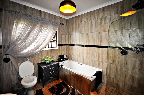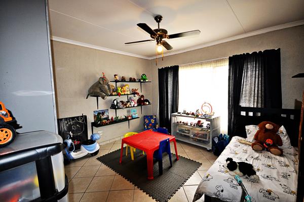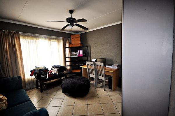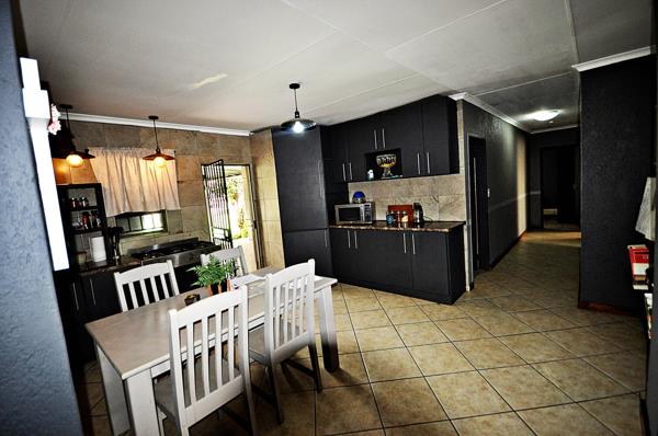 Open-plan lounge, dining area and kitchen with built-in cupboards and a gas stove