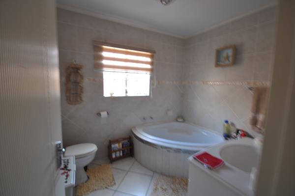 The second bathroom is fully tiled to the ceiling and includes a corner bath, basin, toilet, blinds, and heated lights.