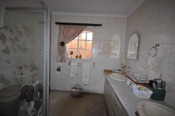 The home features two spacious bedrooms, both carpeted and fitted with built-in cupboards. The main bedroom boasts ample cupboard space, air conditioning, a ceiling fan, and a luxurious en-suite bathroom with an above-average shower, his-and-hers basins, toilet, heated lights, and distinctive carpeted flooring.