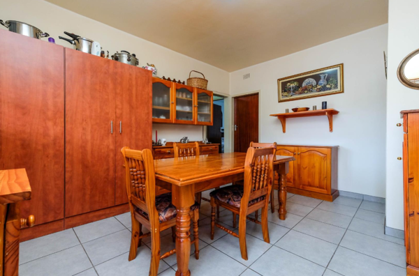 The dining room seamlessly connects to the well-appointed kitchen, which boasts generous built-in cupboards, ensuring plenty of storage space. It is equipped with a hob, an under-counter oven, an extractor fan, and a washing machine connection, making daily tasks effortless. The lounge is spacious and inviting, offering a comfortable area to relax and unwind.