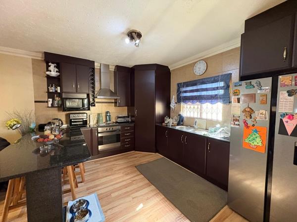 The double garage offers room for a washing machine and tumble dryer, with one garage door that opens through to the backyard. Outdoors, a covered entertainment area with a built-in braai provides the ideal setting for year-round gatherings. The home is further enhanced with an inverter system, two batteries, and four solar panels, ensuring uninterrupted power supply during load-shedding. A large water tank adds to the propertys self-sufficiency, giving you peace of mind and convenience.