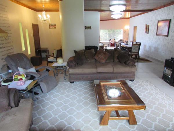 There are 5 well sized bedrooms where main bedroom is larger than your average size bedroom, with walk in cupboards, fitted dressing table, carpeted floors and main on suite bathroom. 3 Spacious additional Bathrooms. 2 Study rooms both with fitted cupboards one in use as a sewing room. Laundry room with all washing machine fittings and cupboard space for laundry detergents. Outside Wendy house in use as a man cave with power and a bar. Alarm system with borehole. Automated gate with paved driveway. Tandem garage automated can park 4 cars. Carport for 1 car ALL THIS IN AN UPMARKET AREA TOO MUCH TO MENTION, FOR SURE A MUST SEE!!!MAKE THIS ONE YOURS. CALL!!!