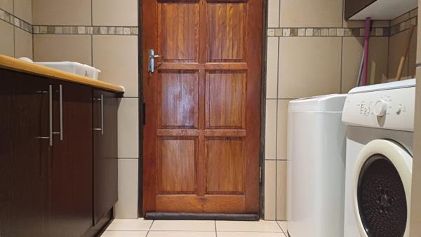 The entire unit is tiled throughout, ensuring easy maintenance and a fresh, contemporary look, while downlights installed throughout create a warm and inviting ambiance. The open-plan kitchen is generously sized, with a scullery that leads to the backyard, complete with a washing line. The kitchen also includes space for a 4-seater breakfast table, perfect for family meals or casual dining. The main bedroom offers built-in cupboards, air conditioning, and an en-suite bathroom featuring a basin, toilet, and shower. The second bedroom includes a built-in cupboard and provides access to the family bathroom, which is equipped with a basin, toilet, and a relaxing corner bath.