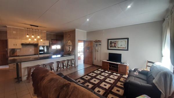 Open-plan lounge and dining area that flows seamlessly onto a covered patio with a built-in braai