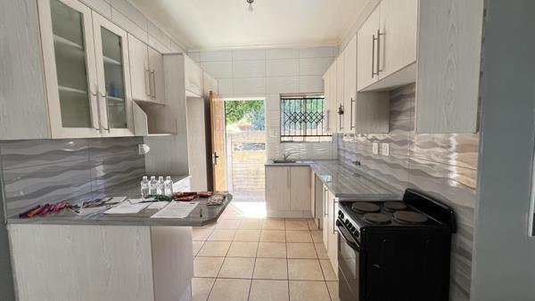 It features three sunny bedrooms, a full bathroom with bath and basin, a separate toilet, and a modern kitchen fitted with built-in cupboards, tiled finishes, and an electric stove.