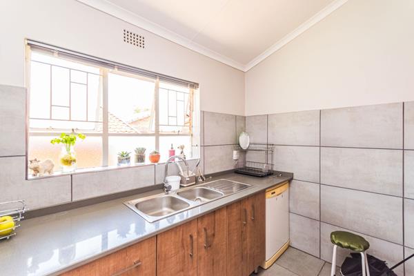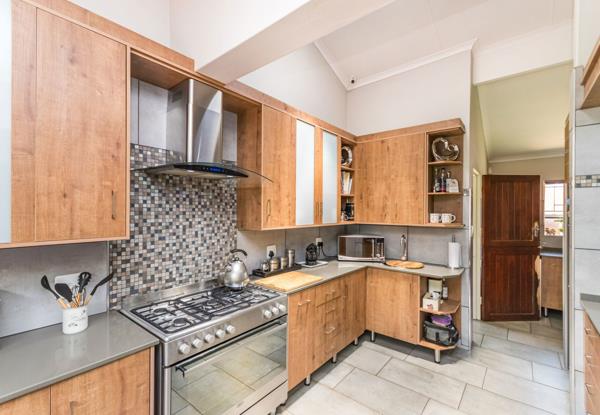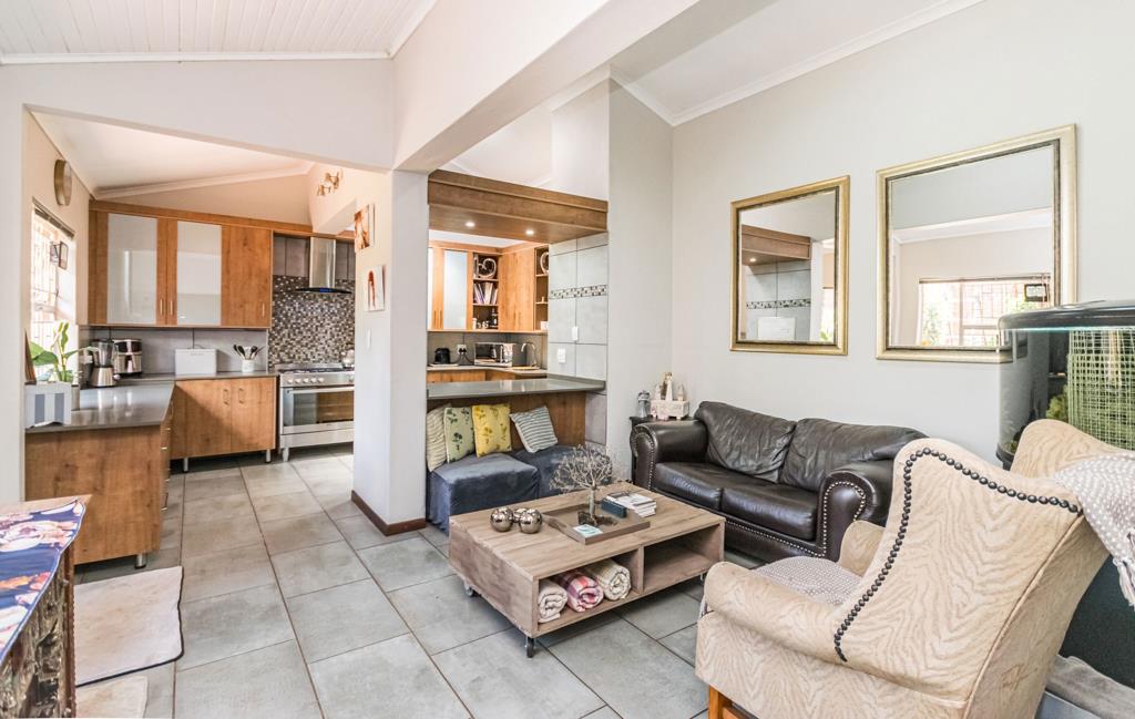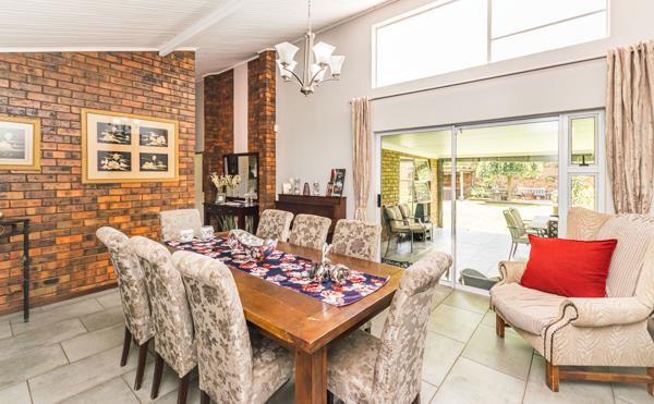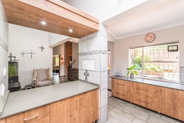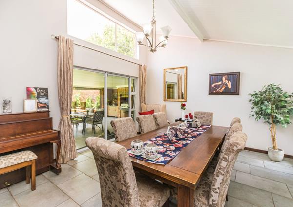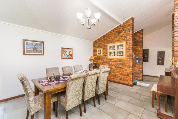 The open-plan kitchen and living area create a warm, inviting flow, complemented by a formal dining room that opens directly into the fully enclosed braai area. The familyTV room also connects seamlessly to the same enclosed braai space, making it ideal for gatherings. The enclosed patio, finished with neat tiled flooring and a built-in braai, provides access to both the dining room and TV room while overlooking a manicured backyard garden and relaxing outdoor jacuzzi.