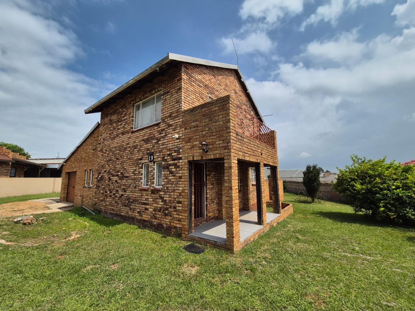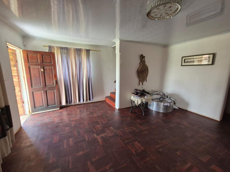This two-story brick residence in Greenhills Ext 3, Randfontein, offers a substantial 1004 sqm erf, presenting an excellent opportunity for a family home. The exterior features a covered ground-floor patio and an upper balcony, overlooking a generous green yard. A solid wooden front door welcomes you into the interior, where classic parquet flooring and good natural light define the living spaces. The home boasts two spacious lounges, providing ample room for relaxation and entertainment, ready for your personal styling.