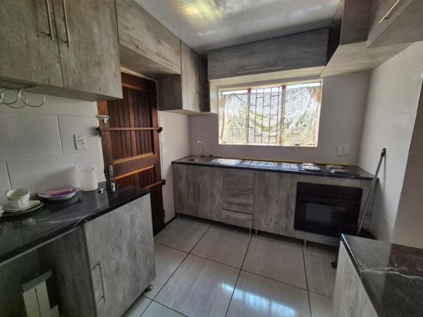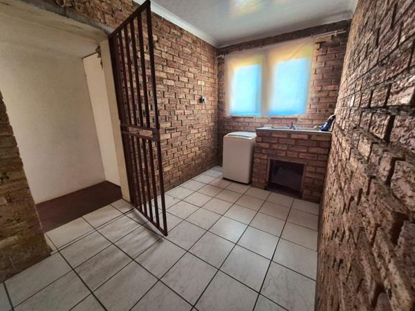 Outdoor living is enhanced by the large garden, perfect for children and pets, as this property is pet-friendly. A dedicated utility area with exposed brick walls, tiled flooring, and space for a washing machine and sink adds practicality. Security is well-addressed with a fully walled perimeter, fence, access gate, security gate, and burglar bars throughout. Parking includes a single garage and additional open parking space.