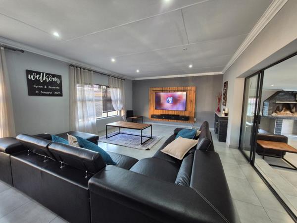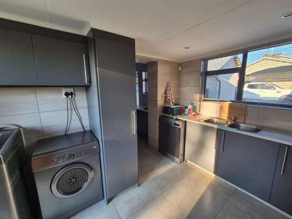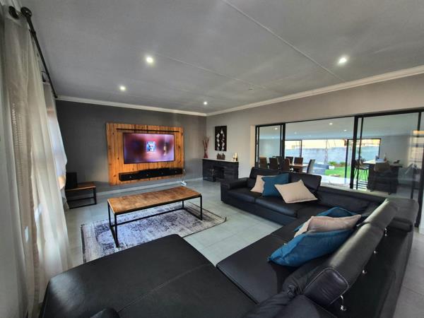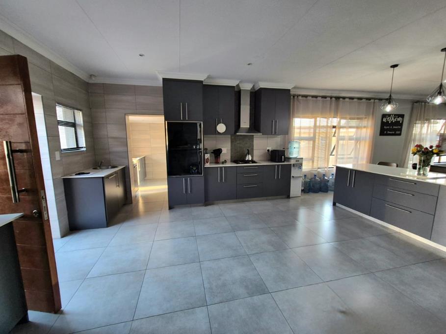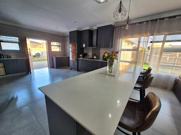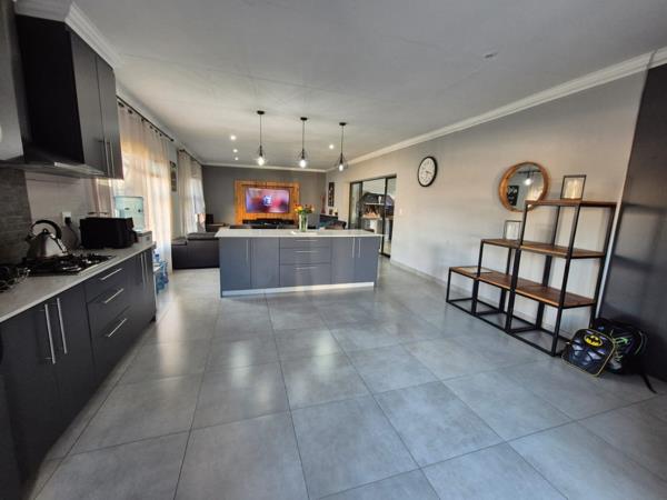 This modern family home in Greenhills, Randfontein, offers a spacious and contemporary living experience. The heart of the home features an inviting open-plan layout, seamlessly connecting the lounge, dining room, and a dedicated familyTV room. The stylish kitchen is a highlight, boasting dark cabinetry, light countertops, a large island with seating, and modern pendant lighting, all complemented by sleek tiled flooring. A convenient laundry area and a built-in bar enhance the functionality and entertainment potential of the interior.
