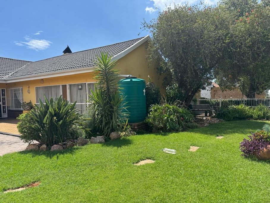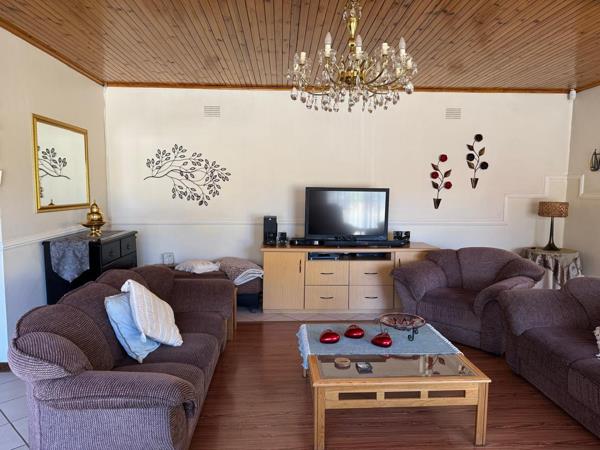 The main house boasts three generously sized bedrooms, including a luxurious main en suite with a shower, basin, and toilet. All bedrooms feature built-in cupboards, ceiling fans, and sleek tiled flooring for added comfort and convenience. Designed for both relaxation and entertainment, the home offers multiple living spaces, including a cozy lounge, a spacious TV room with elegant wooden ceilings and laminated flooring, and two stylish dining areasone complete with a built-in braai and ceiling fan, perfect for hosting guests.