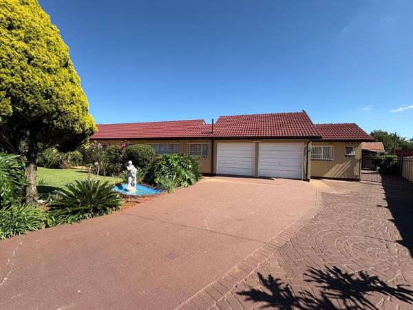 Outside, the property boasts two single garages, a double carport, and an additional outside room. For relaxation or socializing, there is a thatch-roof lapa and a sparkling pool, all set within a well-maintained garden that adds a touch of serenity to the home.
