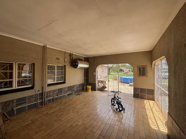 Outdoor living is a highlight, with a refreshing swimming pool and a deck for relaxation. The property also features a lapa, ideal for alfresco dining and entertaining. Practical amenities include two garages and four additional parking spaces, ensuring ample vehicle accommodation. Further enhancing convenience are staff quarters, a dedicated laundry room, and ample storage facilities. The expansive garden, though currently featuring some dry grass areas, offers significant potential for landscaping and is pet-friendly.