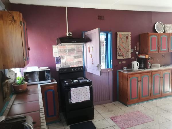 Inside, the home boasts a comfortable 288 sqm floor size, featuring an open-plan layout that connects the living spaces seamlessly. It comprises a welcoming lounge, a dedicated dining room, and an additional family TV room, providing versatile areas for daily living and entertainment. The kitchen presents a distinctive and vibrant aesthetic with custom-built wooden cabinetry, featuring colourful accents, set against deep purple walls. It includes tiled floors, essential appliances like a stove, microwave, and extractor fan, alongside a convenient pantry for additional storage.