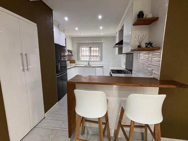 The home comprises three well-proportioned bedrooms and two bathrooms, including a private en-suite for added comfort. Outside, residents can enjoy a private patio, perfect for entertaining, complete with a built-in braai and paving. The property also includes two garages, providing secure parking and additional storage.