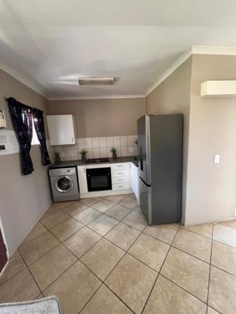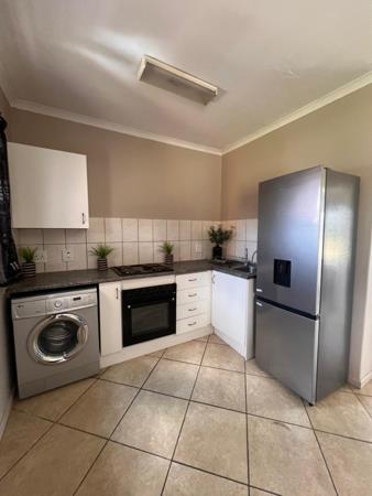 Inside, the unit boasts a functional layout with tiled flooring throughout, ensuring easy maintenance. The lounge area is designed for comfort, featuring neutral wall colours and benefiting from natural light, creating an inviting atmosphere. The compact, L-shaped kitchen is efficiently equipped with modern stainless steel appliances, including an integrated oven, hob, and washing machine, alongside sufficient cabinet and counter space for daily needs.