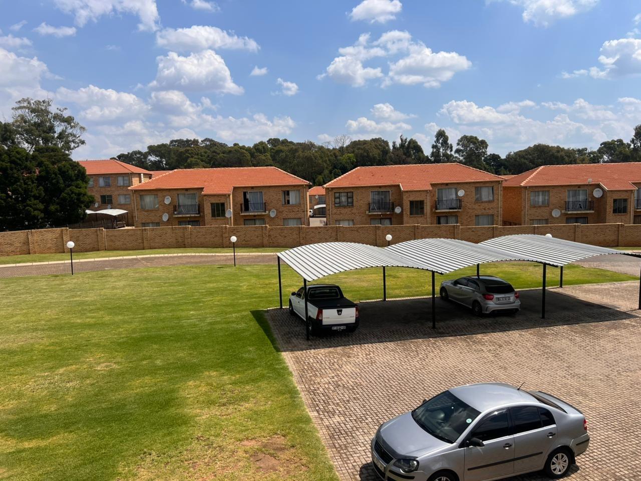 The complex features durable brick construction with terracotta roofs, complemented by a well-kept communal lawn and extensive paved areas, including ample covered carports. Street lighting enhances safety and convenience, contributing to the overall kerb appeal of this Randfontein property.