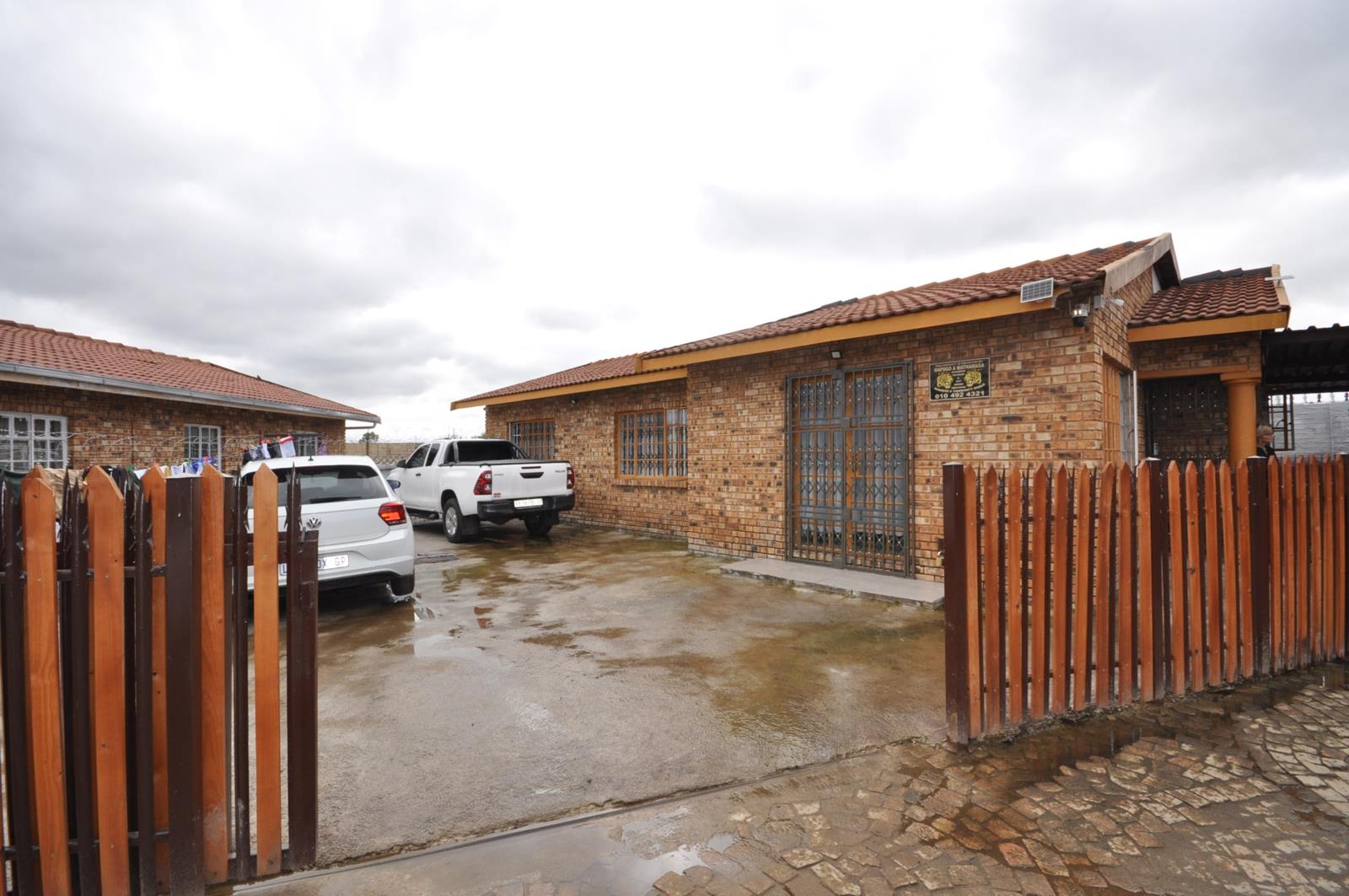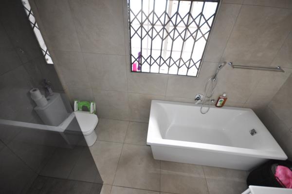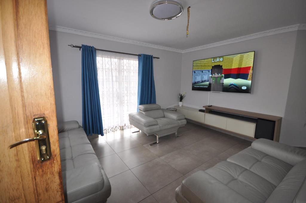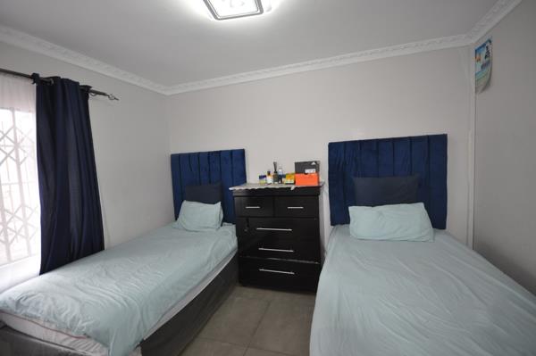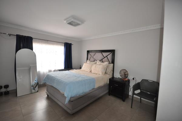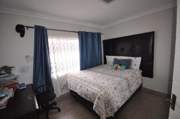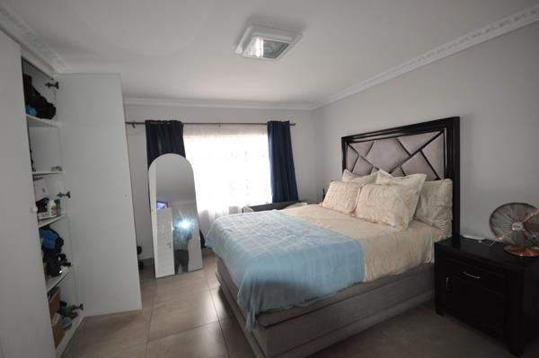 The property features three well-sized bedrooms, all fitted with built-in cupboards and tiled flooring for easy maintenance. There are two bathrooms, including a main en-suite, ensuring convenience for the whole family.