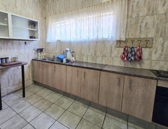 A kitchen with ample cupboards and countertop space for all those everyday appliances, scullery, and a laundry area with a zinc and built-in cupboards.