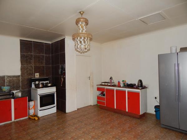 Huge kitchen with some built-in cupboards, ordinary stove, space for all appliances and a dining set, and a separate scullery.