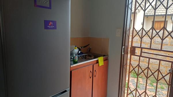 Inside, the bright and welcoming lounge sets a comfortable tone, with neutral colours and modern furnishings creating a relaxed, homely atmosphere. Tiled floors flow seamlessly throughout, offering both durability and easy maintenance while contributing to the clean, contemporary aesthetic. The compact kitchen is smartly designed with modern modular cabinets, a designated space for a microwave, and room for essential appliances, catering efficiently to everyday living needs.