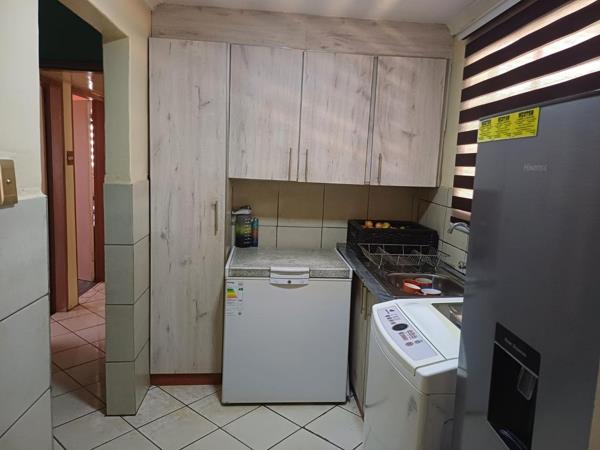 The beautifully designed kitchen is both functional and modern, featuring tiled floors, sleek blinds, and ample storage space. A well-appointed bathroom, fully tiled and equipped with a bath, basin, and toilet, ensures convenience for the household. Additionally, a versatile storeroom offers the potential to be converted into an en-suite bathroom, as it already includes a shower and toilet.