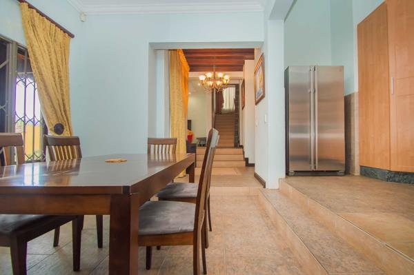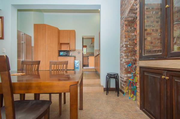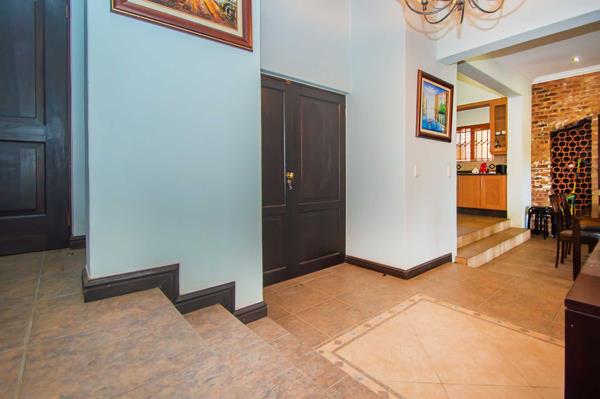 Step inside to an inviting interior with a unique split-level design, tiled flooring, and a welcoming entrance hall. The living spaces include a comfortable lounge and a dining room, complemented by an open-plan kitchen with separate scullery and cooking area. Architectural details such as a vaulted ceiling, a classic chandelier, and an exposed brick wall with a built-in wine rack add character and warmth throughout the home. A guest toilet provides additional convenience.
