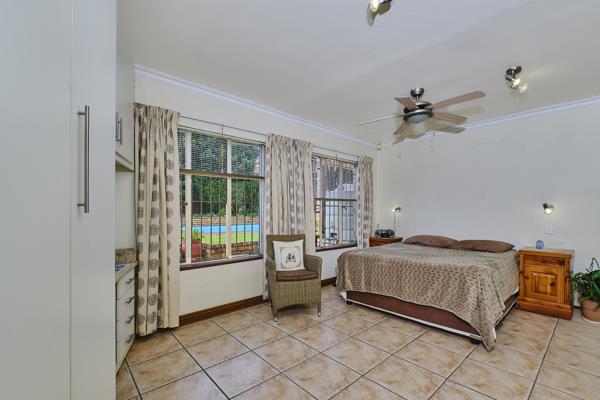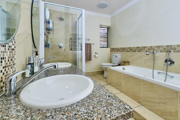 The main bedroom is generously sized, offering ample cupboard space, a built-in dressing table, and a cozy study or sewing nook with views of the garden. The ensuite bathroom is bright and beautifully finished, complete with a large bath, shower, his-and-her double vanity sinks, grab rails, an extractor fan, heater, and glass bricks that allow for natural light.