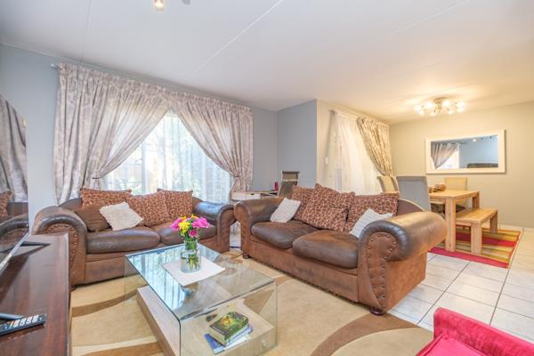 The bright and spacious living area flows effortlessly through sliding doors to a covered patio with a built-in braai perfect for entertaining guests or unwinding in the privacy of your garden.