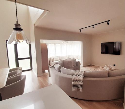 Double Volume Open-Plan Living: Sun-drenched living spaces flow effortlessly, from the gracious formal lounge to the inviting dining area, exiting out via stackable folding doors to the private front garden.