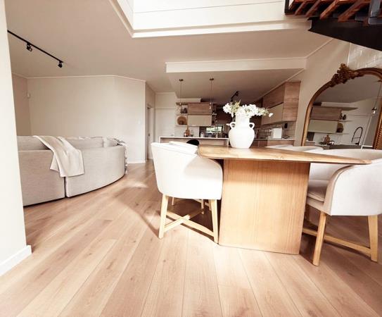 Luxury light wood laminate flooring, installed throughout the entire residence.