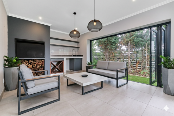 Entertaining is effortless with the fully enclosed patio boasting stacker doors, a built-in braai, fitted cabinetry, and a prep basin. Step out onto the pool deck and synthetic grass space framed by mature trees, providing natural privacy and tranquillity.